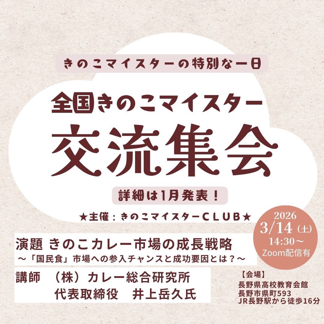 全国きのこマイスター交流集会のお知らせ 2025/12/26 全国きのこマイスター交流集会 講演内容 決定! きのこ好きの皆さん、大集合!全国のきのこマイスターが集い繋がる特別な一日がやってきます! 日時:2026年3月14日(土) 14:30~会場:長野県高校教育会館(JR長野駅から徒歩16分)講演:きのこカレー市場の成長戦略 ~「国民食」市場への参入チャンスと成功要因とは?~講師:井上岳久氏 (株)カレー総合研究所 代表取締役スケジュールを空けて、ぜひご参加ください♪詳細は1月に発表いたします Share