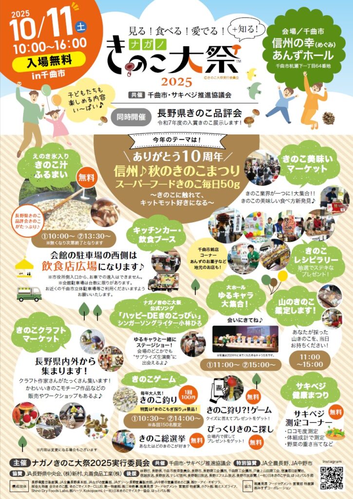ナガノきのこ大祭2025開催します 2025/10/06 今年のテーマは\ありがとう10周年/信州♪秋のきのこまつりスーパーフードきのこ毎日50g~きのこに触れて、キットモット好きになる~ 日時 10月11日(土) 10:00~16:00会場 信州の幸あんずホール 千曲市杭瀬下一丁目64番地入場 無料同時開催 長野県きのこ品評会(令和7年度の入賞作品展示します) 楽しめる♪内容い~っぱいあります。ぜひご家族・友達お誘いあわせのうえ、お出かけください! Share