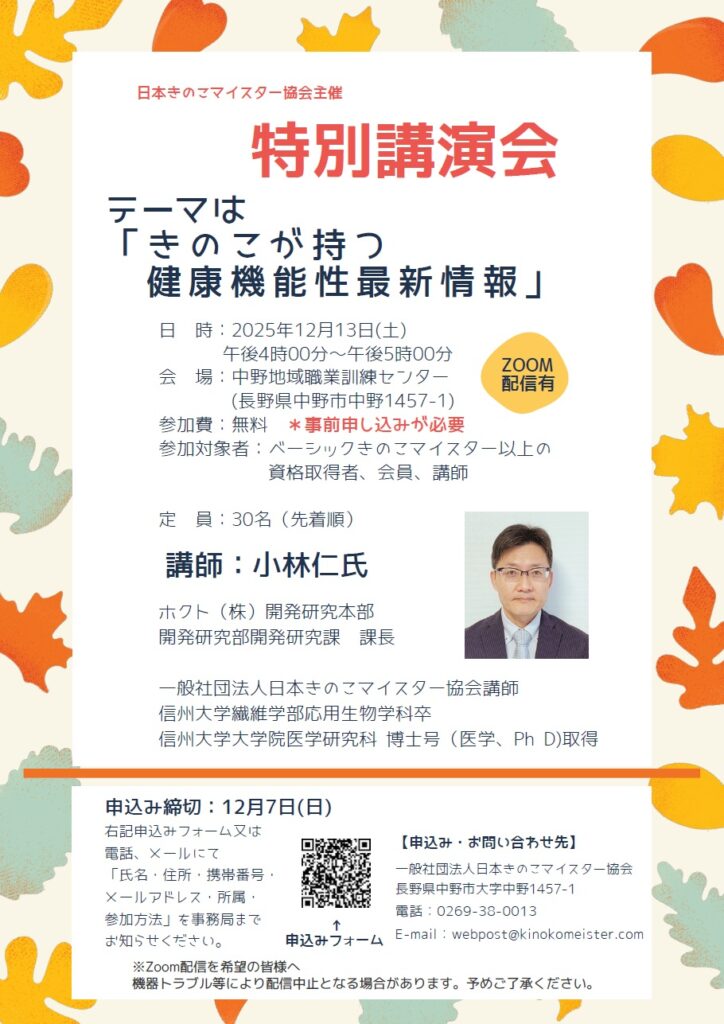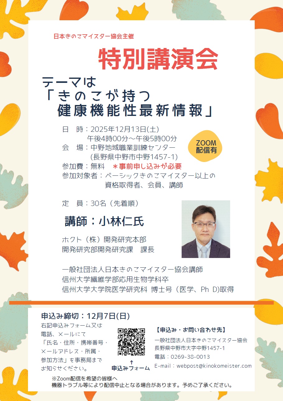 日本きのこマイスター協会主催の特別講演会を下記により開催いたします。