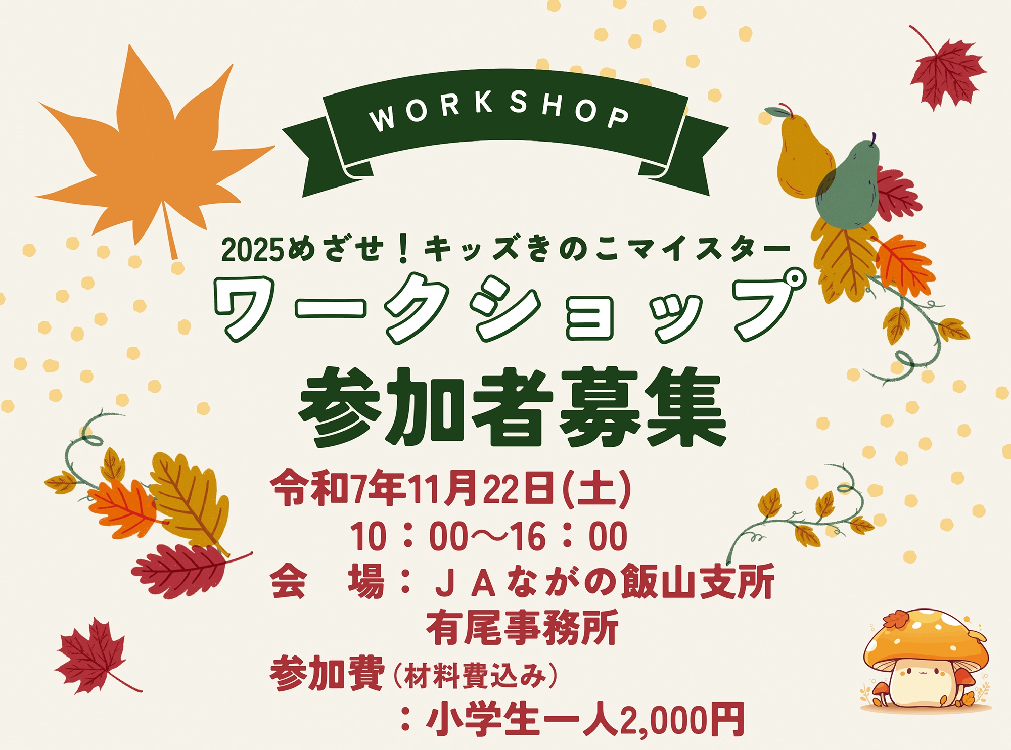 | 留意事項 | ※保護者同伴でご参加をお願いいたします。 ※工場見学(飯山市内)の会場までは各自家用車で移動していただきます。 ※すでにキッズきのこマイスターの認定をうけている方はお申込みいただけません。 |